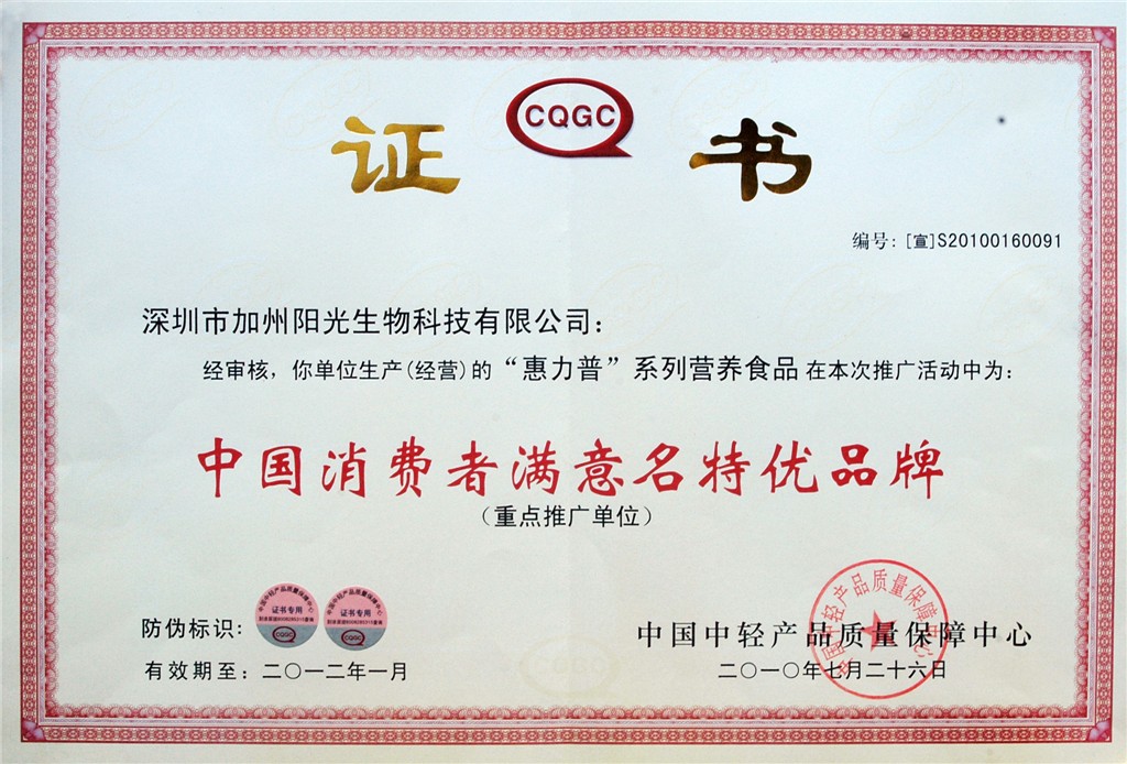 經(jīng)過中國中輕產(chǎn)品質(zhì)量保證中心評測,我司旗下“惠力普”系列保健品,以其高品質(zhì)、高知名度、高市場美譽(yù)度,在眾多同類產(chǎn)品中脫穎而出,于2010年7月26日被中國中輕產(chǎn)品質(zhì)量保證中心授予“中國消費(fèi)者滿意名特優(yōu)品牌(重點(diǎn)推廣單位)”榮譽(yù)稱號。