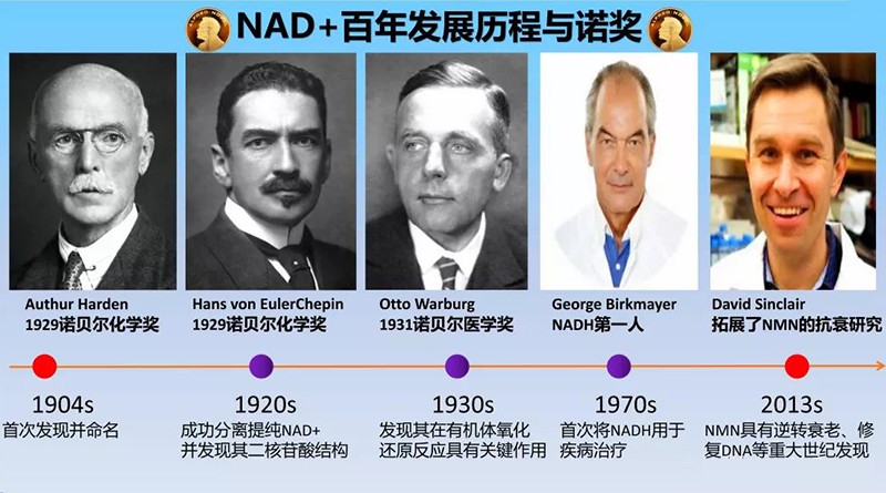 NMN與NAD+發(fā)展史 1904年,首次發(fā)現(xiàn)NAD+ 英國生物化學(xué)家亞瑟.哈登(Sir Arthur Harden)爵士首次發(fā)現(xiàn)NAD+, 而后哈登爵士在1929年獲得諾貝爾化學(xué)獎;